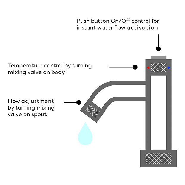 - Push button On/Off control for instant water flow activation