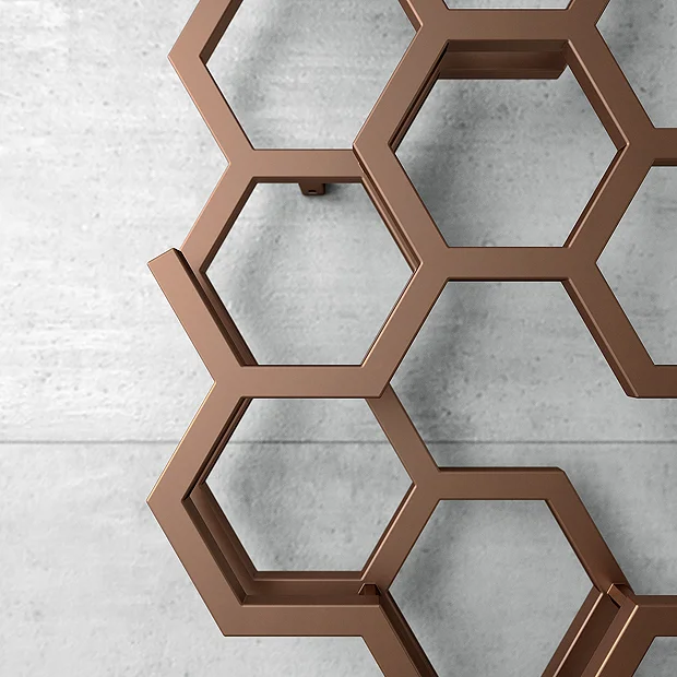 Winner of the IF Design Award 2017, the Terma Hex Radiator has an eye-catching geometric design that helps bring out the character of any room. It includes HXP type mounting brackets that allow you to adjust the distance of the radiator from the wall. Crafted from high grade materials with a Bright Copper finish.